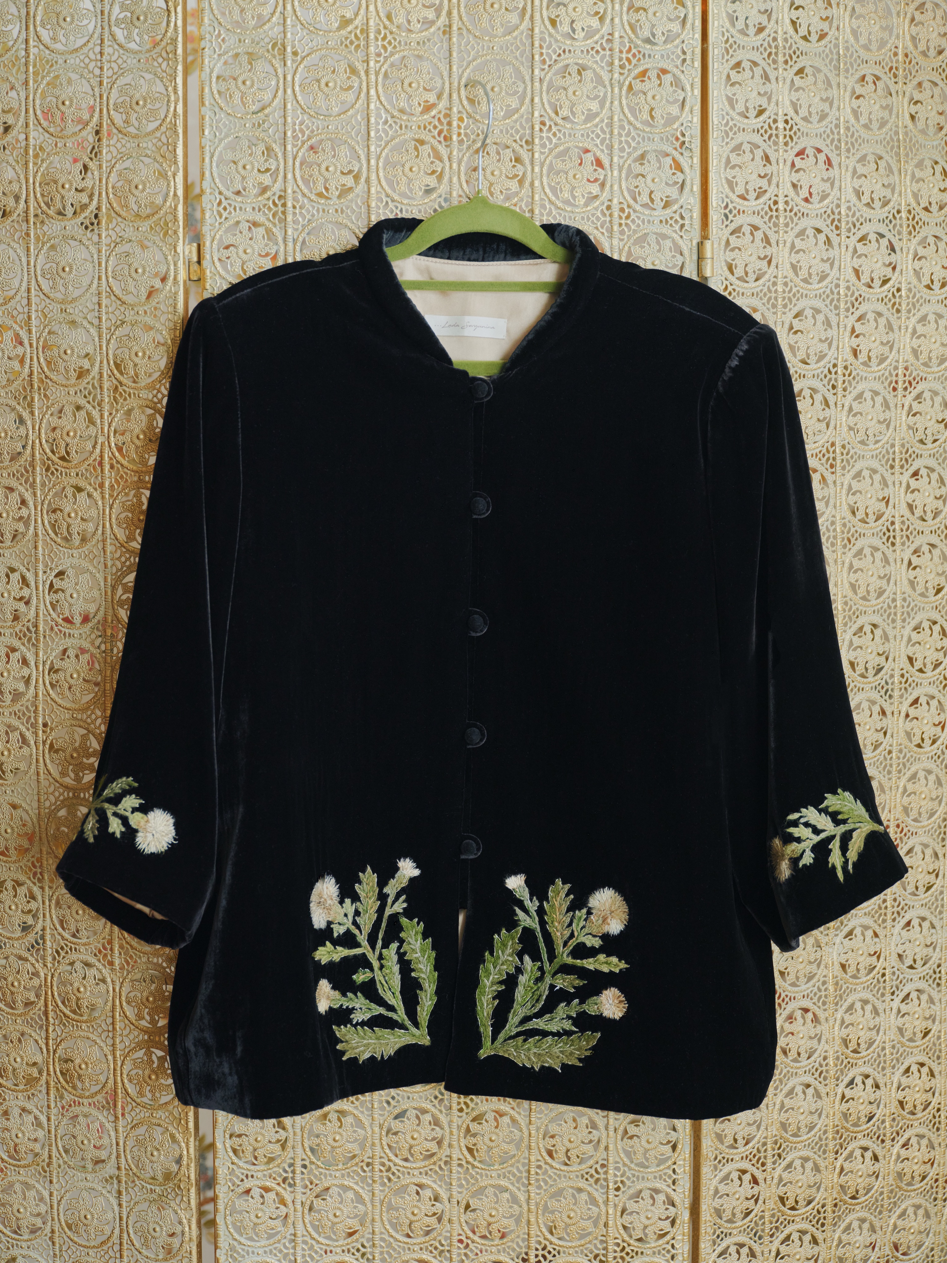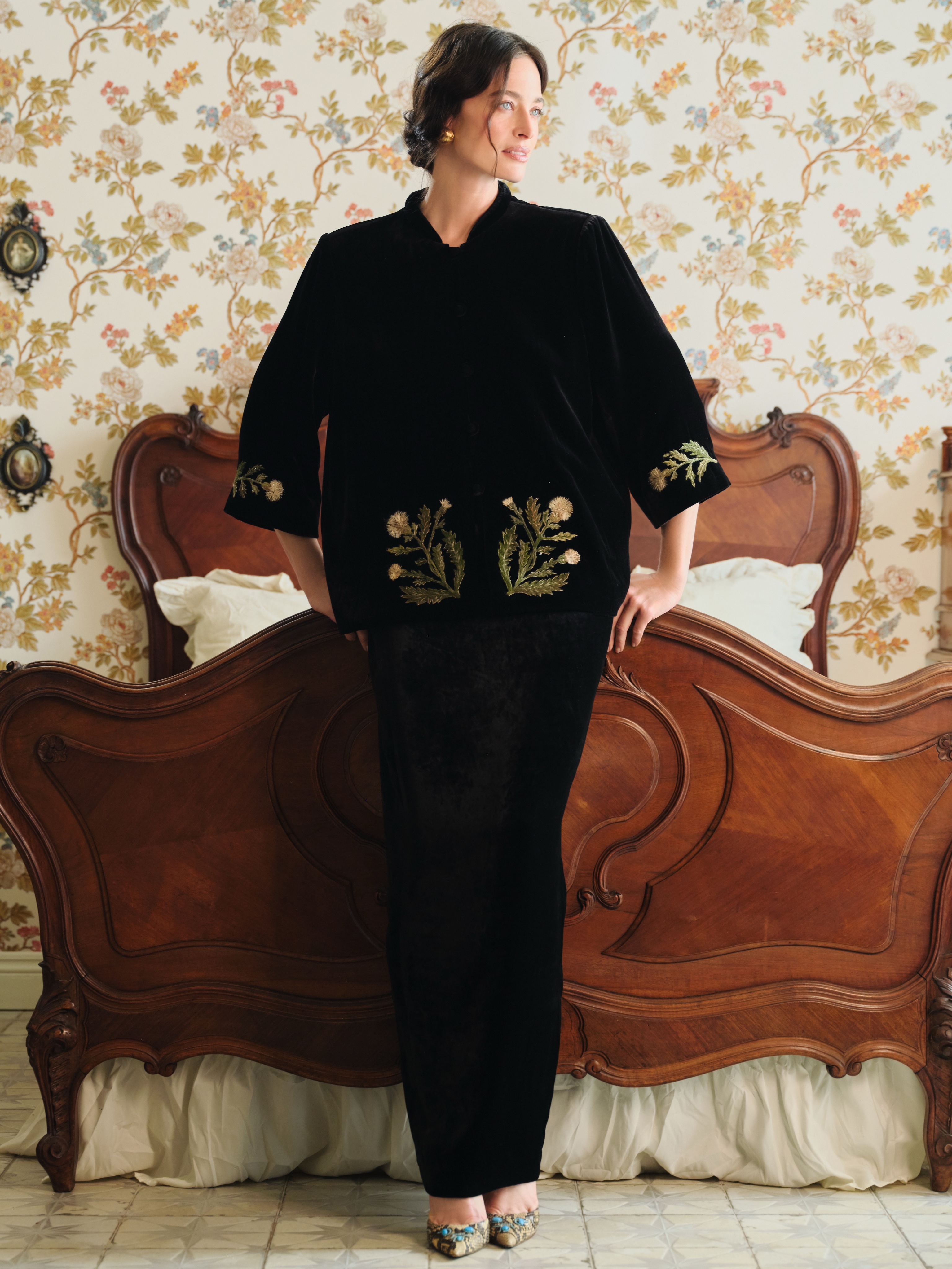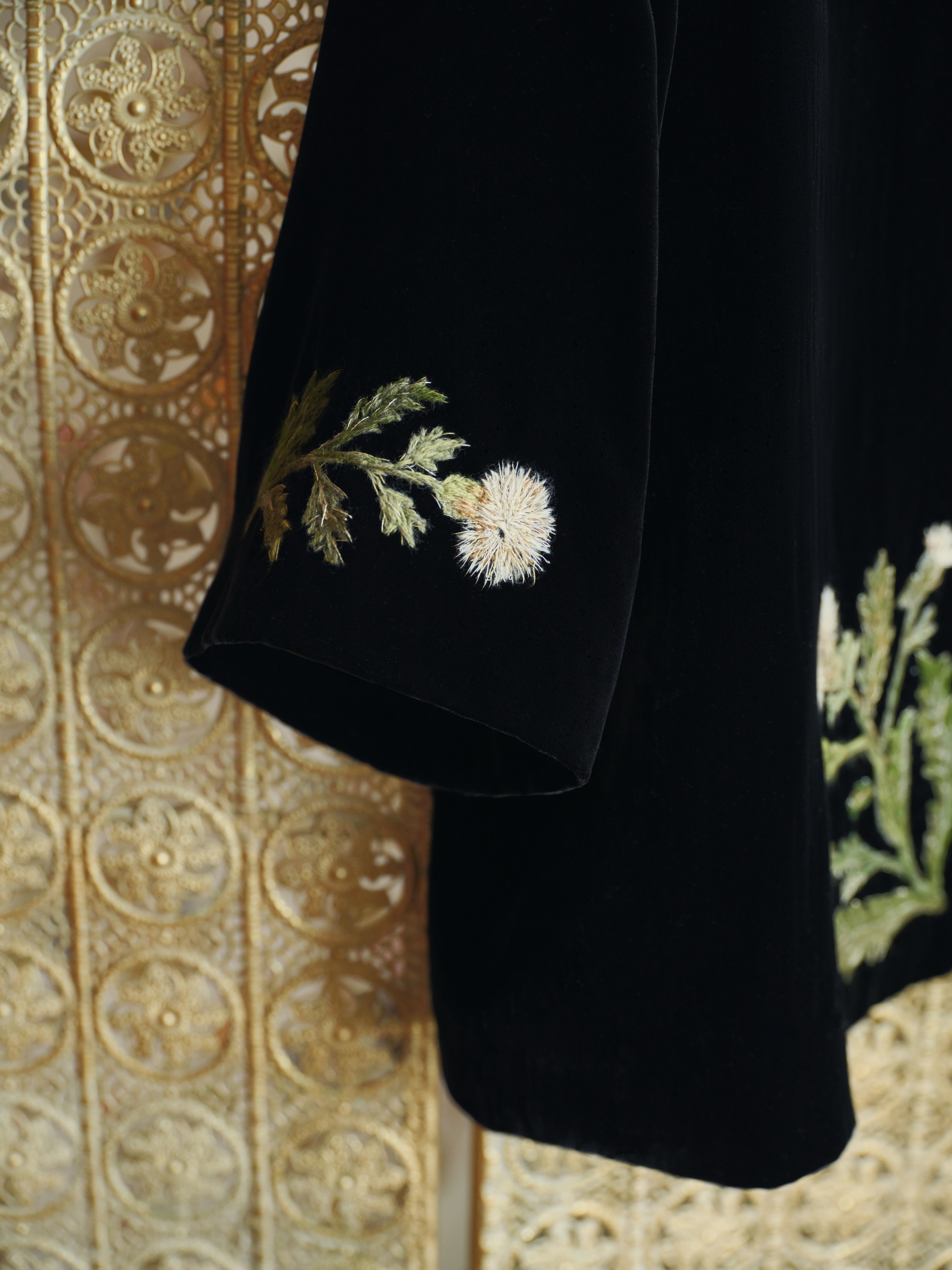 Костюм из глубокого чёрного шёлкового бархата, в котором строгая лаконичность силуэта переплетается с богатством фактуры. Ручная вышивка «чертополох» оживляет ткань нежными стеблями и светлыми соцветиями, словно пойманный фрагмент старинного гербария. Прямой жакет с бархатными пуговицами, объёмный воротником-стойкой, рукавами ¾ и мягкими плечами идеально сочетается с длинной прямой юбкой, образуя цельный ансамбль, в котором чувствуется и сдержанность, и роскошь.