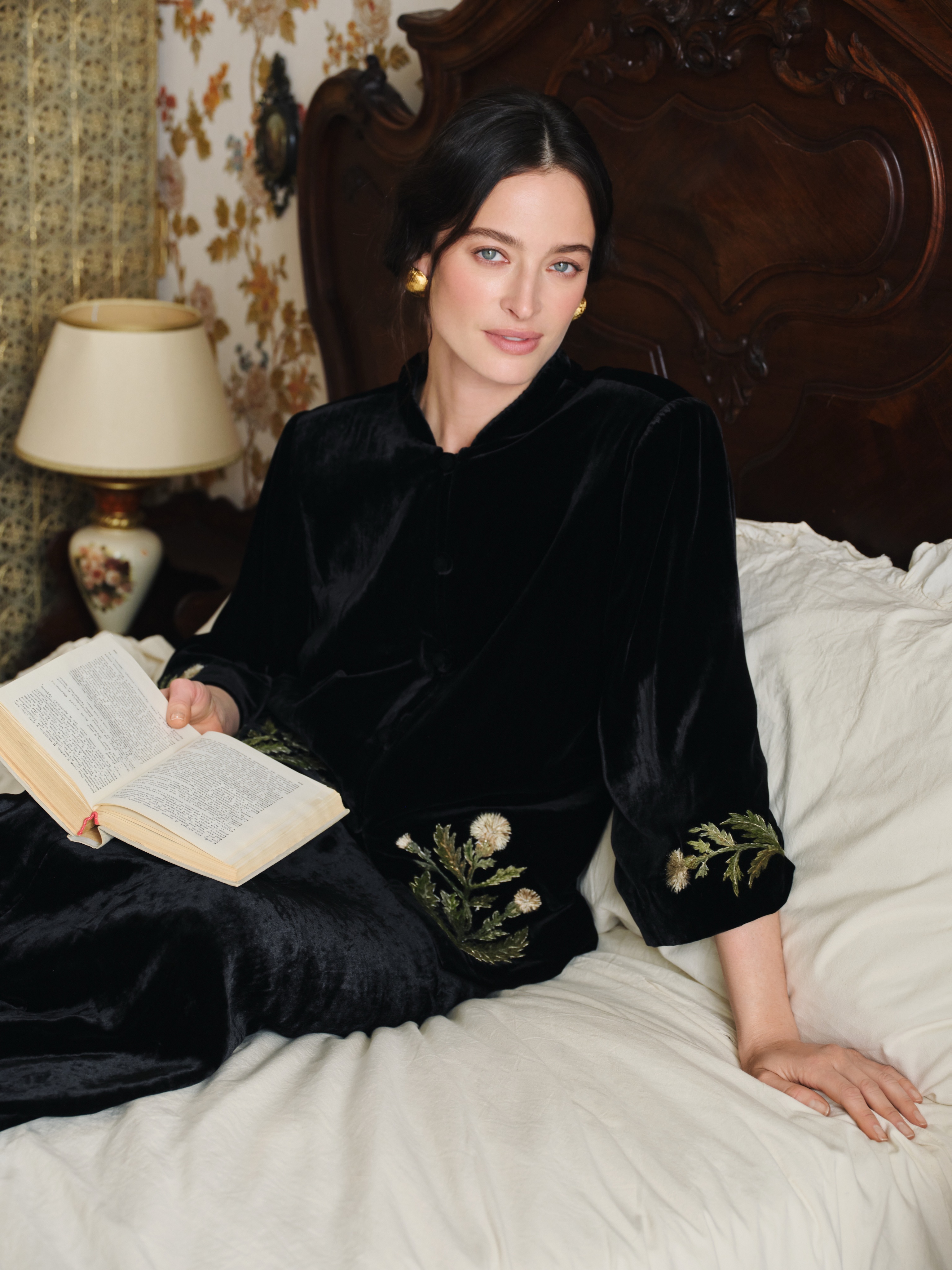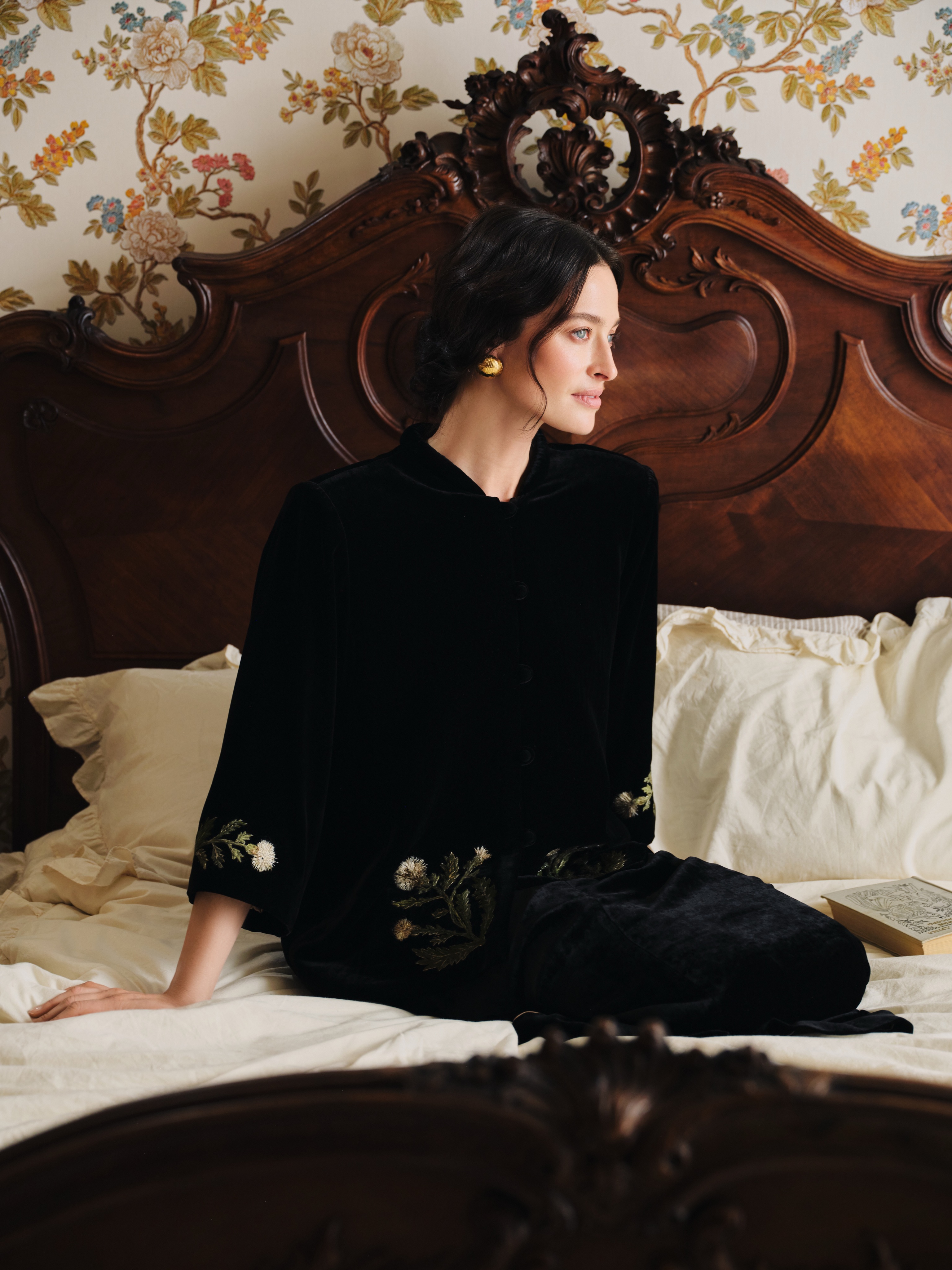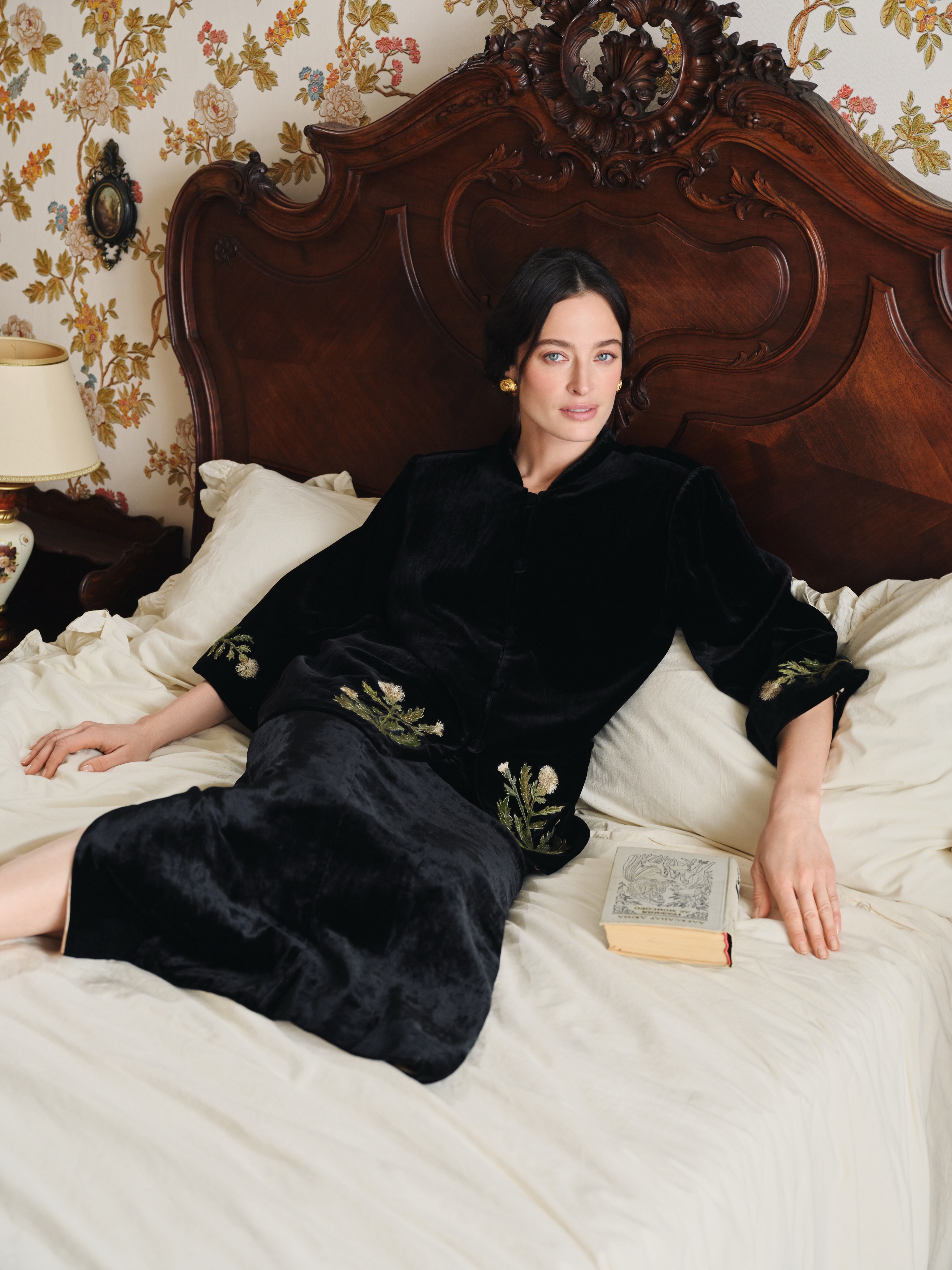 Костюм из глубокого чёрного шёлкового бархата, в котором строгая лаконичность силуэта переплетается с богатством фактуры. Ручная вышивка «чертополох» оживляет ткань нежными стеблями и светлыми соцветиями, словно пойманный фрагмент старинного гербария. Прямой жакет с бархатными пуговицами, объёмный воротником-стойкой, рукавами ¾ и мягкими плечами идеально сочетается с длинной прямой юбкой, образуя цельный ансамбль, в котором чувствуется и сдержанность, и роскошь.