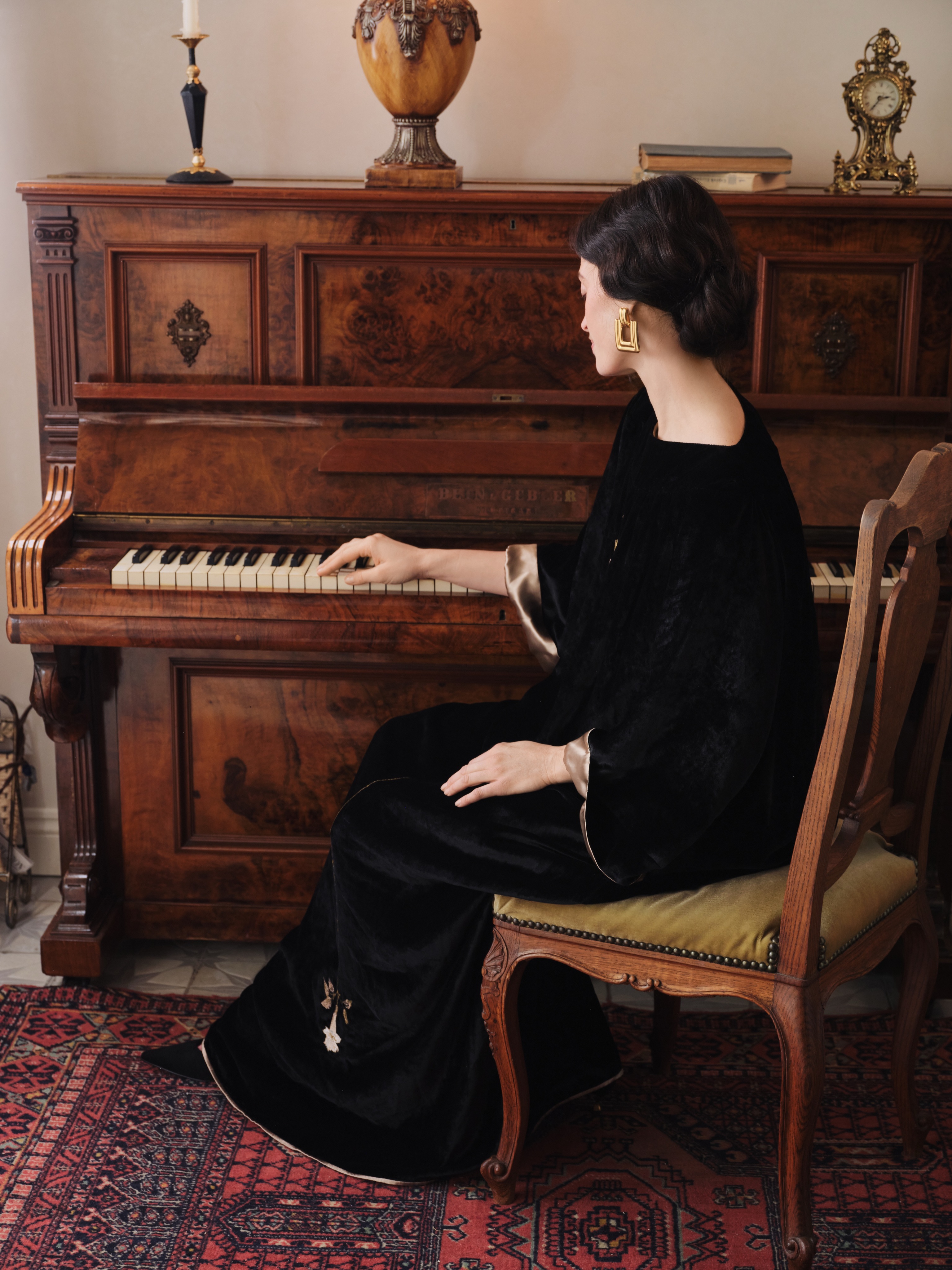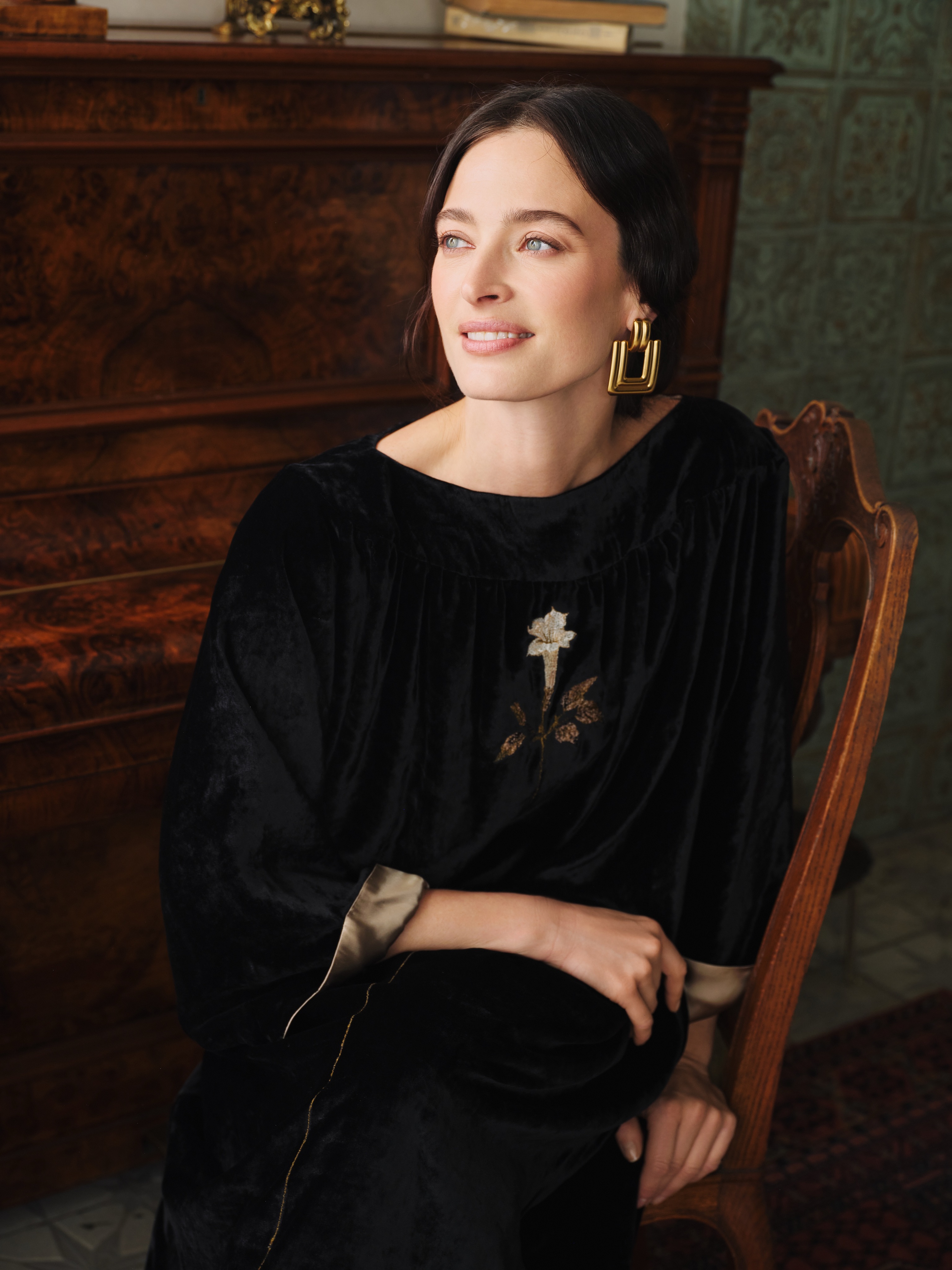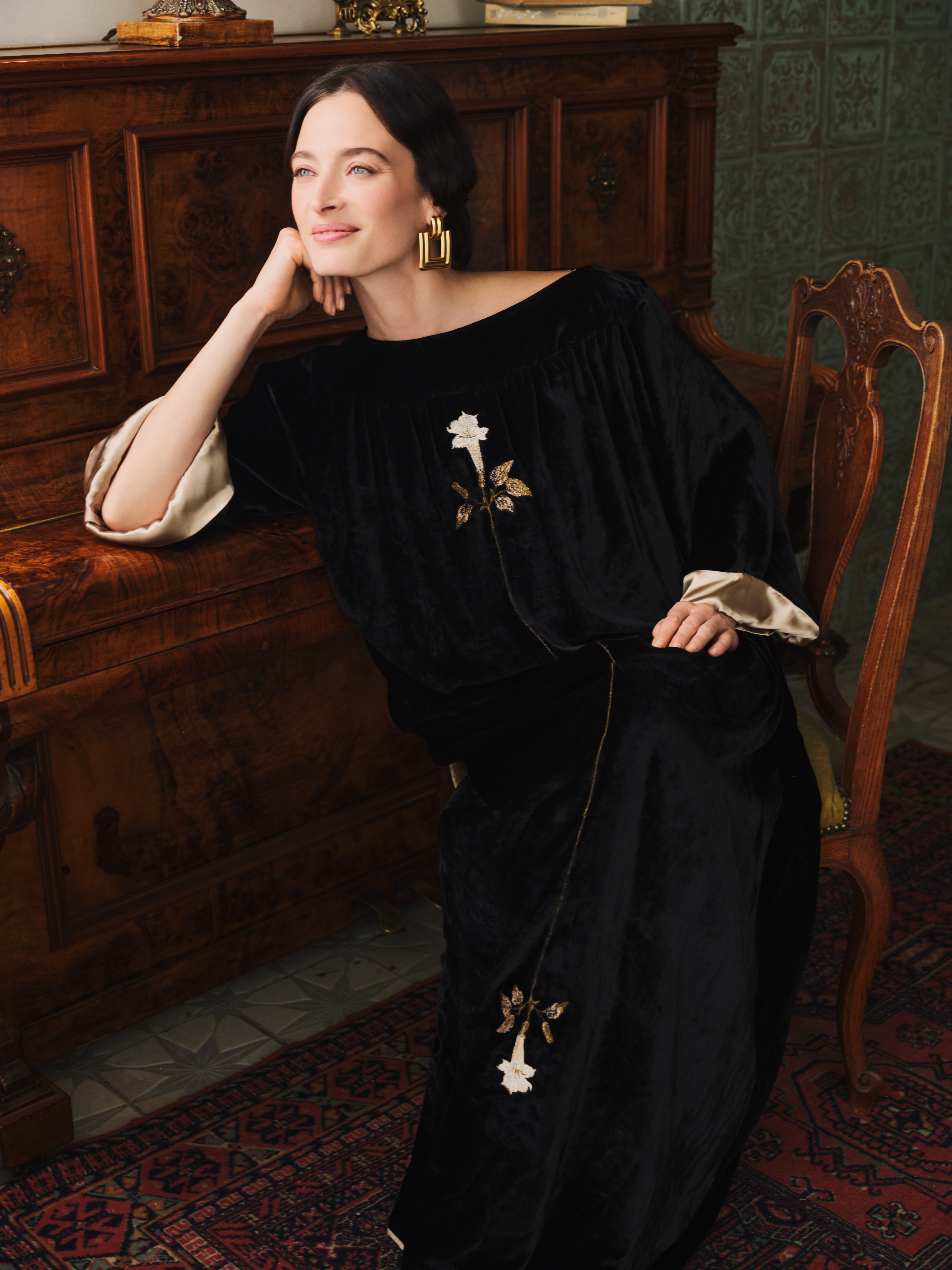 Платье из глубокого чёрного шёлкового бархата свободного кроя. Ткань мягко струится, подчеркивая благородство фактуры.