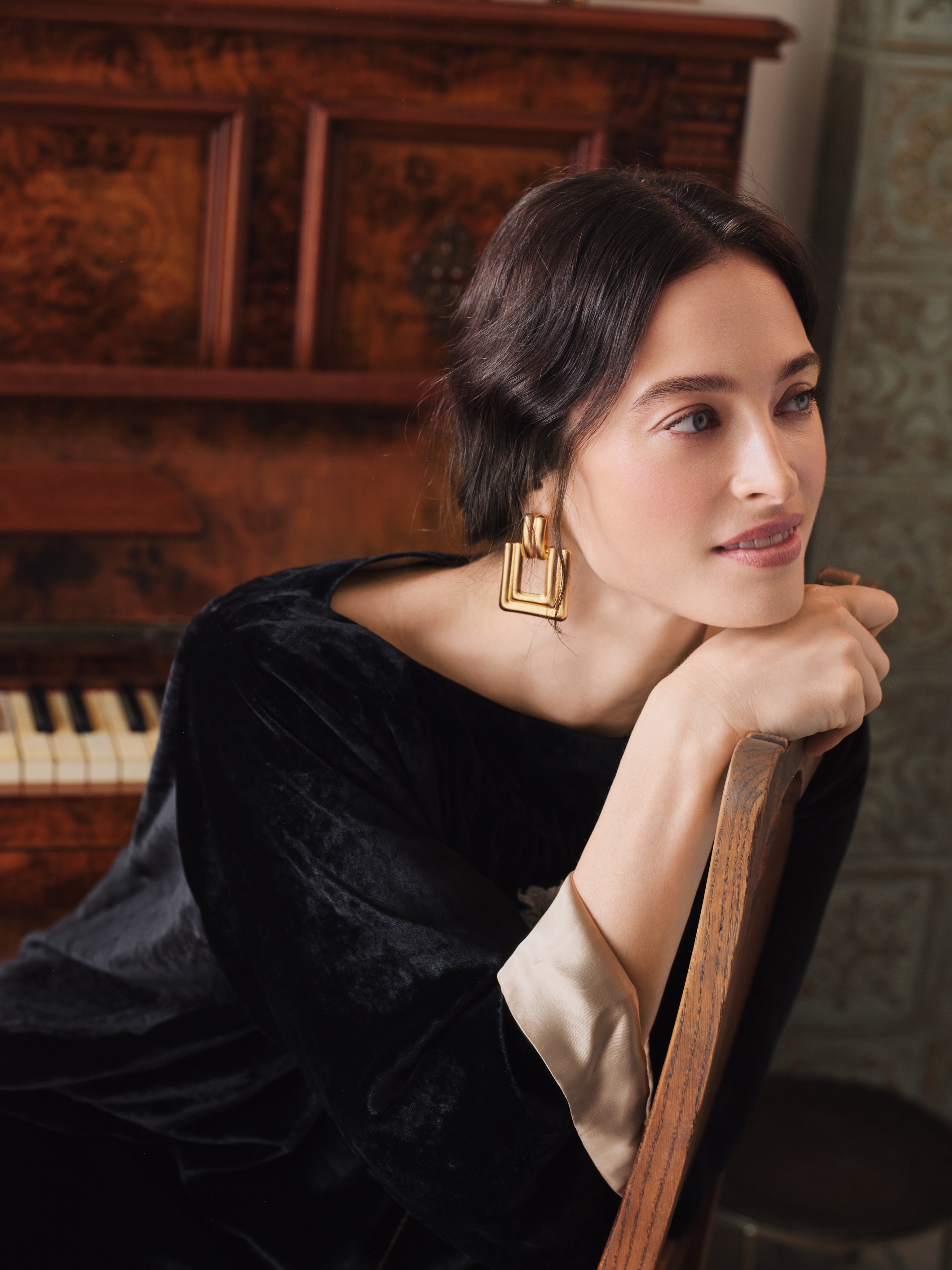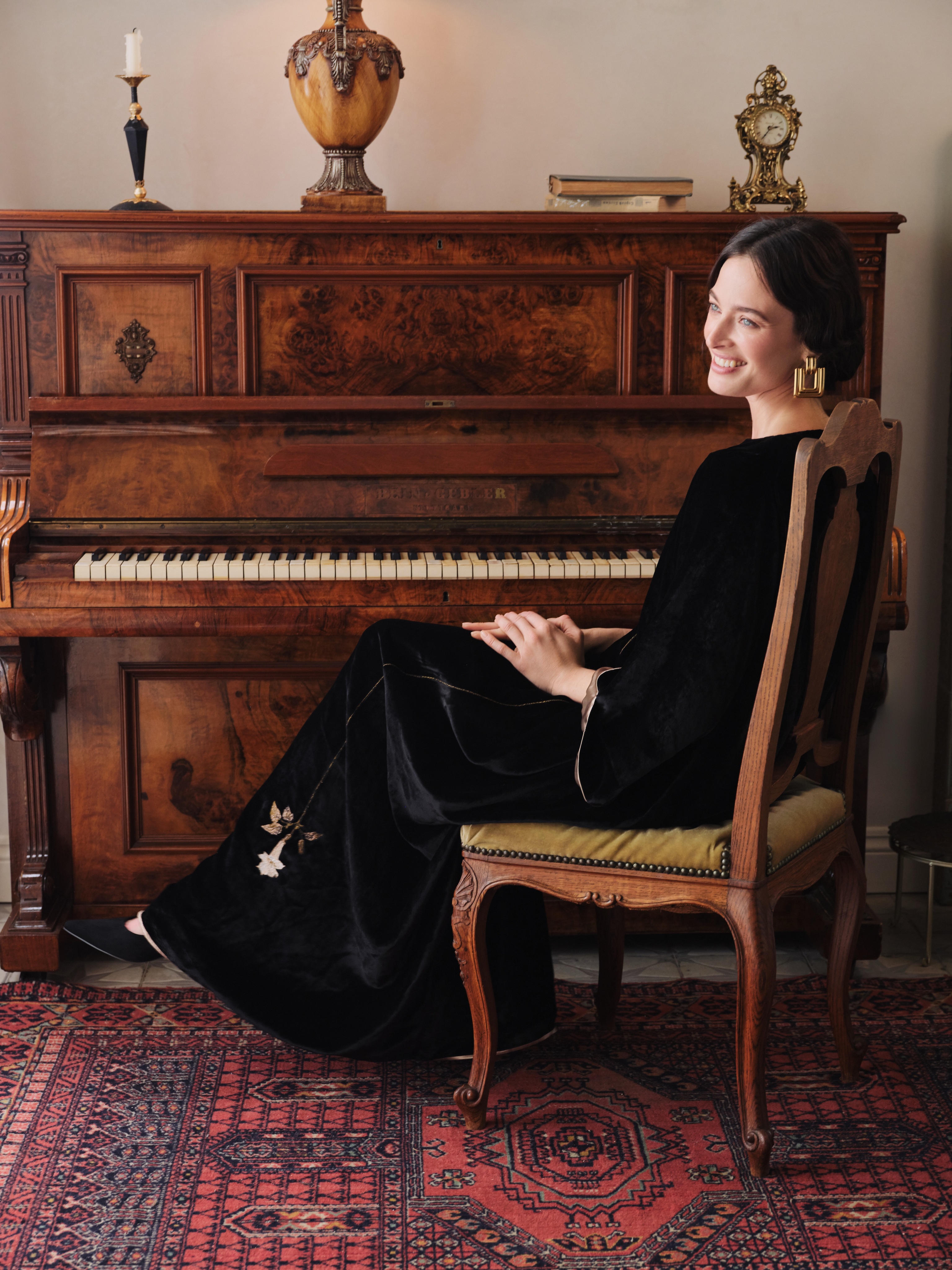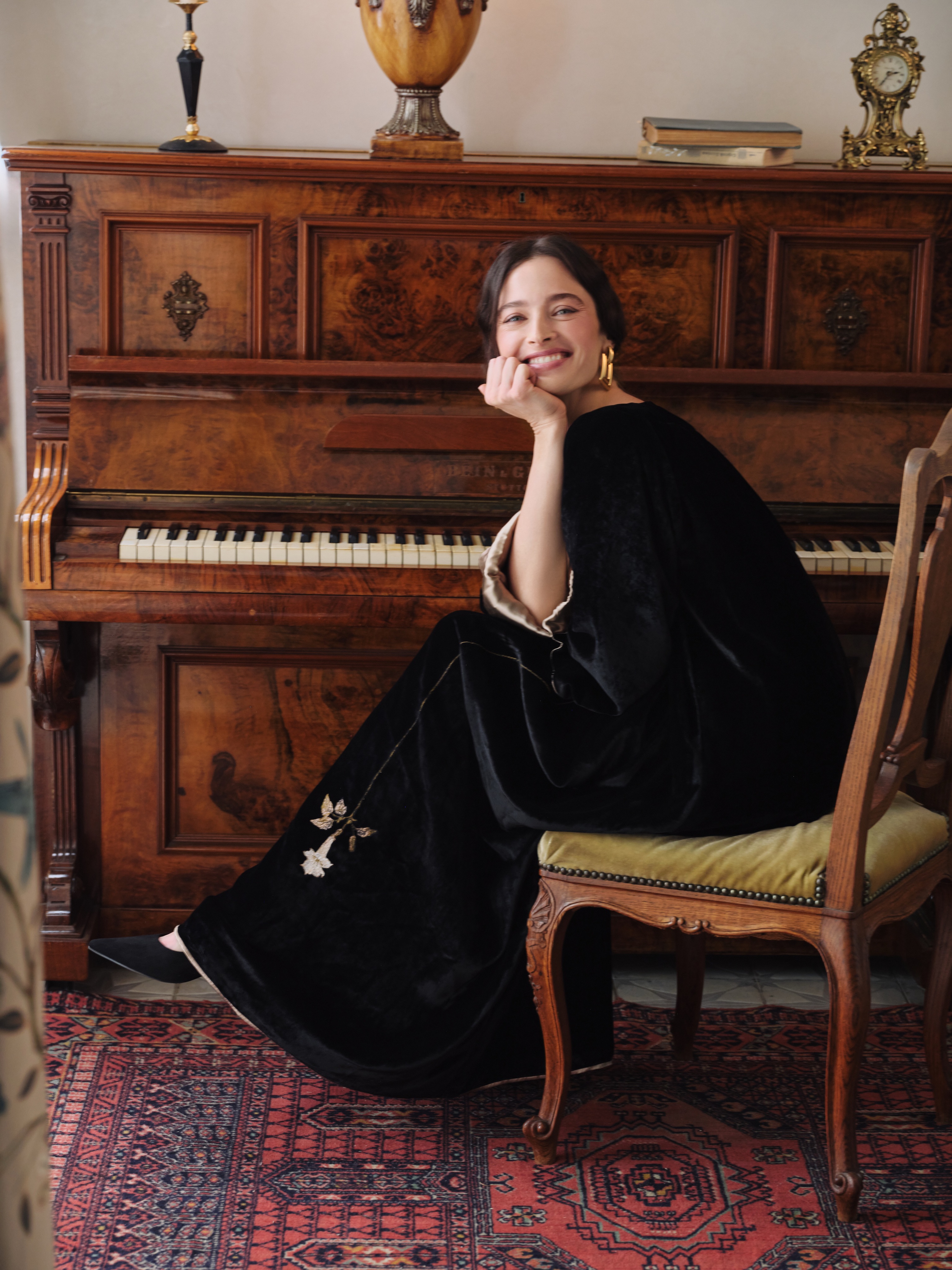 Платье из глубокого чёрного шёлкового бархата свободного кроя. Ткань мягко струится, подчеркивая благородство фактуры.