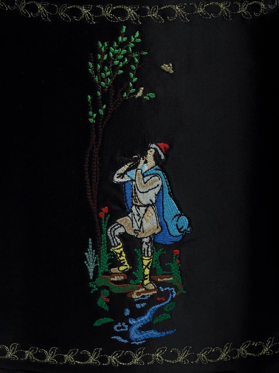 Сюжет вышивки: юный пастушок, играющий на флейте, мотив сказки "Снегурочка".