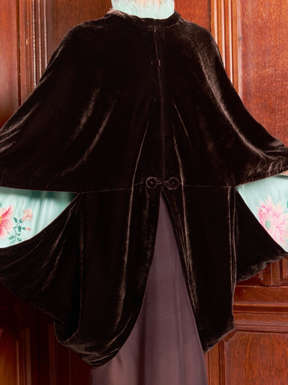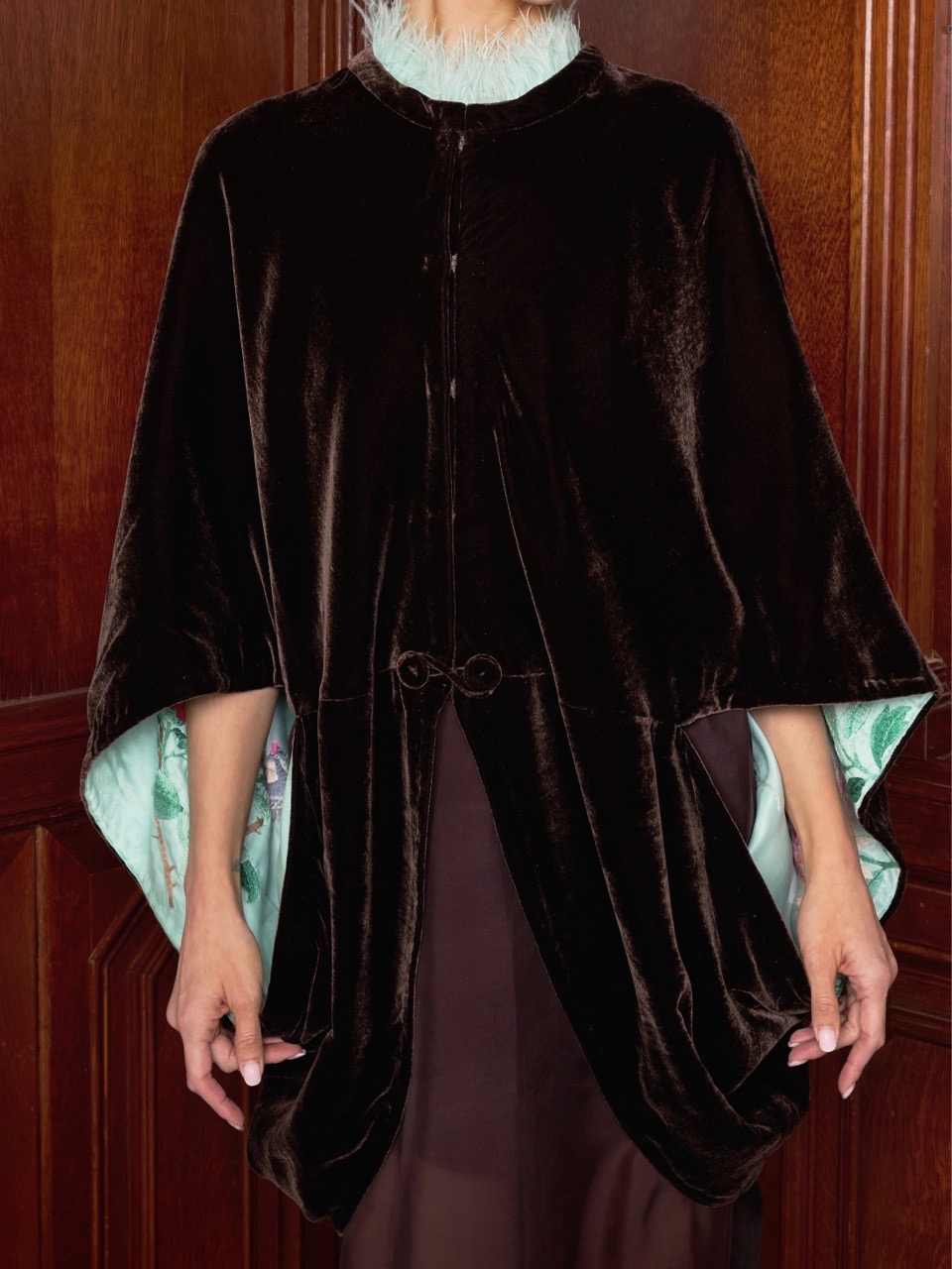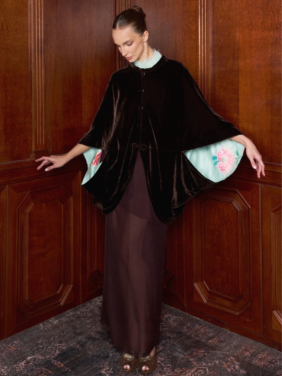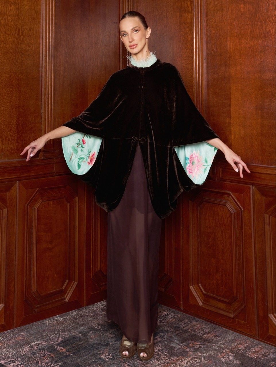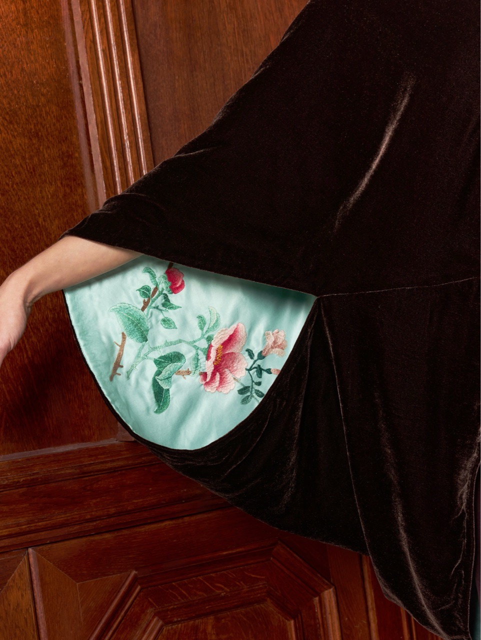 Широкие кейп-рукава скроены таким образом, чтобы при каждом движении открывалась старинная вышивка изнанки