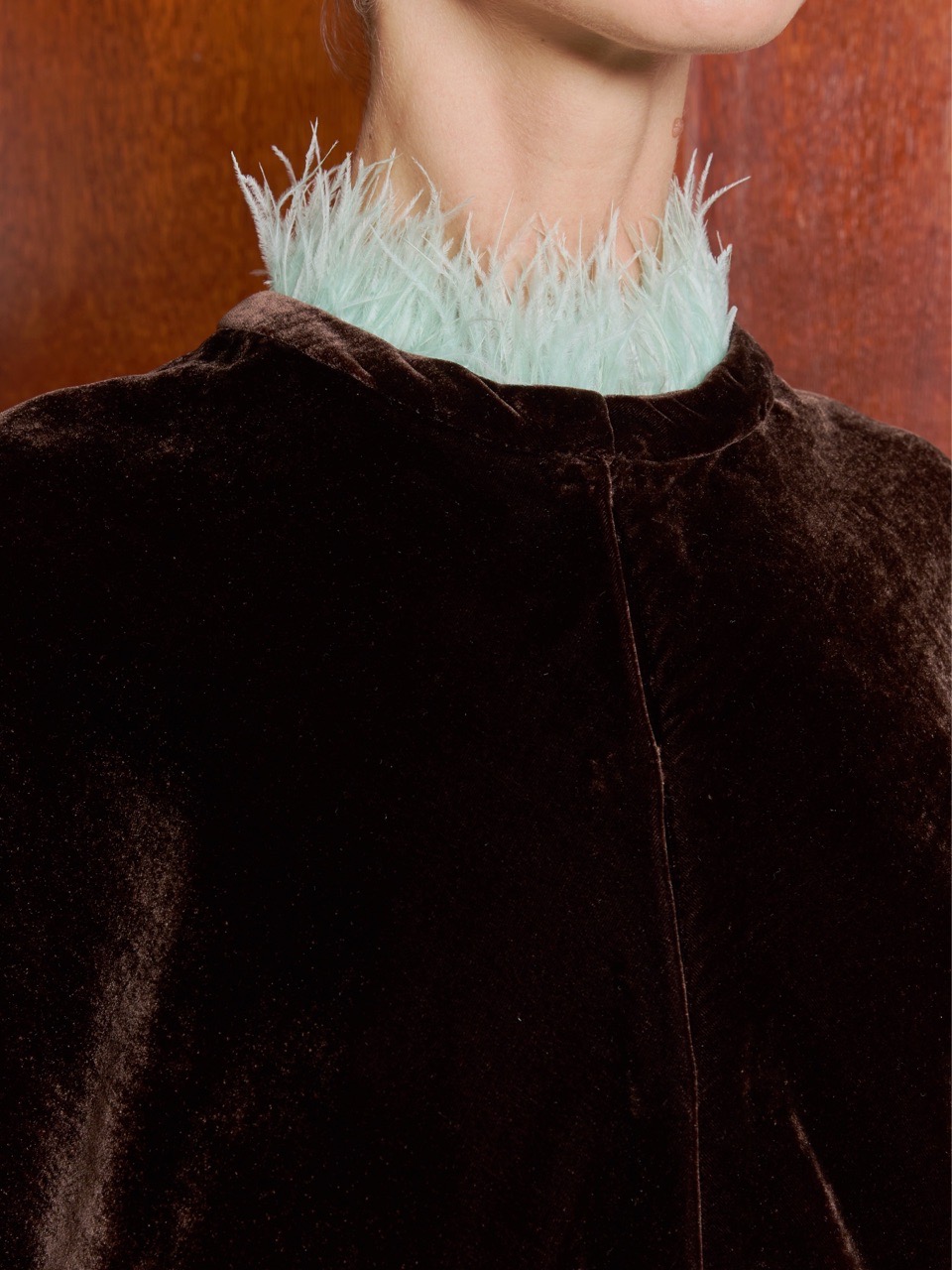 Для съемного воротнка-стойки мы подобрали перья страуса мятного цвета, в тон изнанке