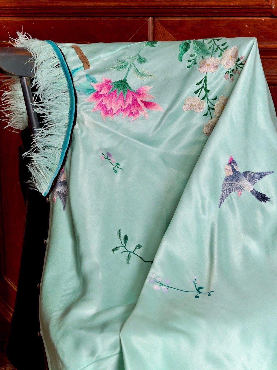 Акцентная изнанка выполнена из раритетной ткани с художественной вышивкой шёлковыми нитями по шёлку в технике акварельной глади и дополнена ручной росписью